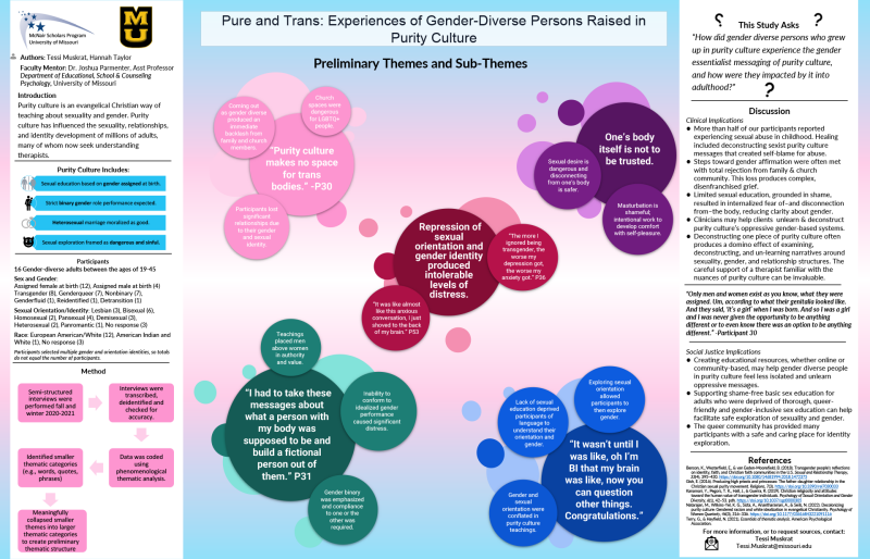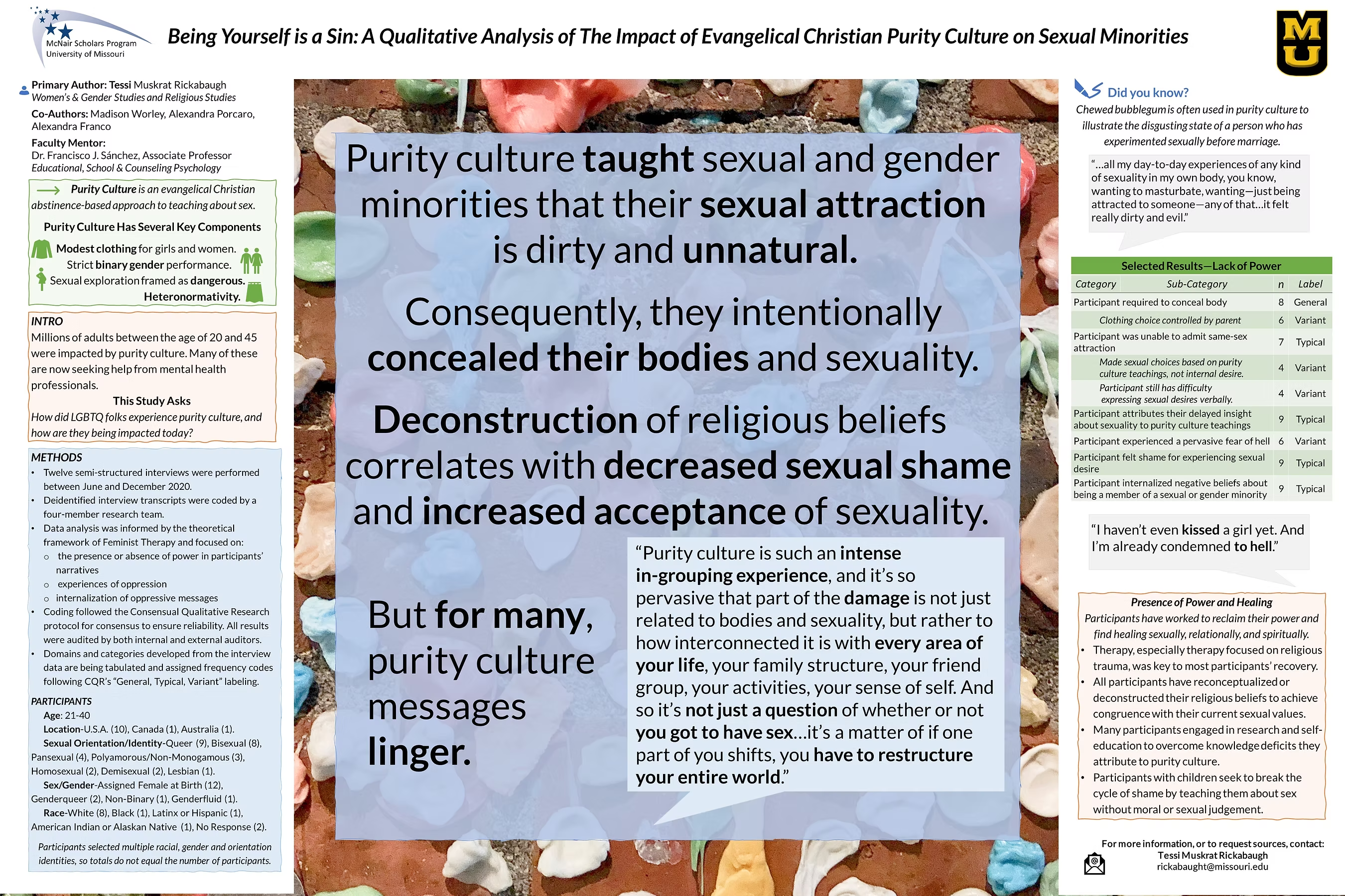 Muskrat, T. Y., Porcaro, A. K., Worley, M. G., Franco, A. E., Parmenter, J. G., & Sánchez, F. J. (2025). “Being Yourself is a Sin”: The Impact of Evangelical Purity Culture on Sexual and Gender Minority People Socialized as Women. The Counseling Psychologist, 0(0). https://doi.org/10.1177/00110000251352578